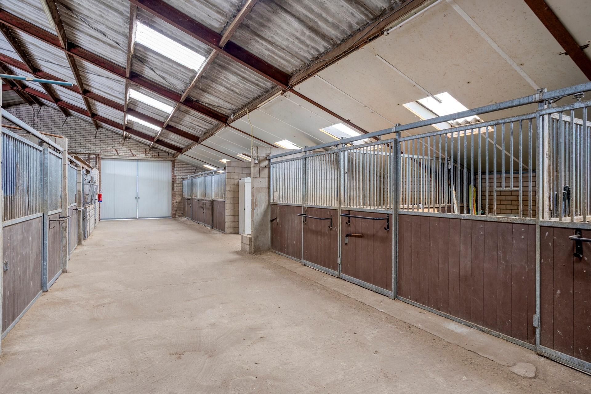 • het dak is gedekt met abc vrije golfplaten met twee lichtstraten en ligt op stalen spanten met een vrije overspanning.