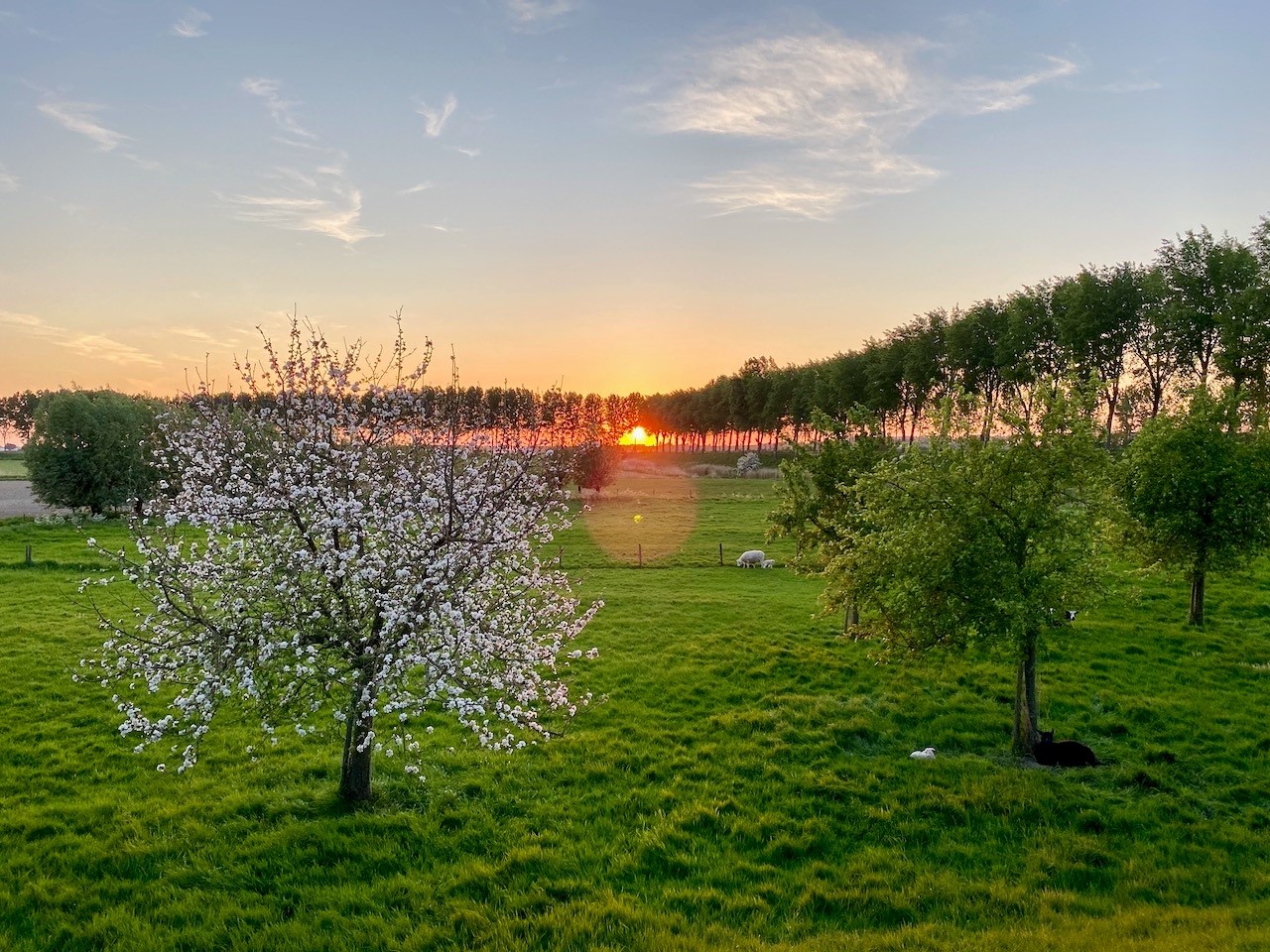 Hobbyweide met hoogstamfruitbomen (appel en peer), twee vijvers en knotwilgen.