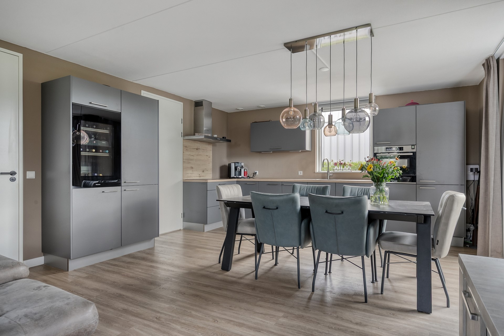 De moderne keuken is voorzien van de benodigde inbouwapparatuur, te weten: inductiekookplaat, combi oven/magnetron, 2 koelkasten met vriesvak, wijnkoelkast, warmhoud lade, Quooker (koud en bruis water), afwasmachine en afzuigkap.