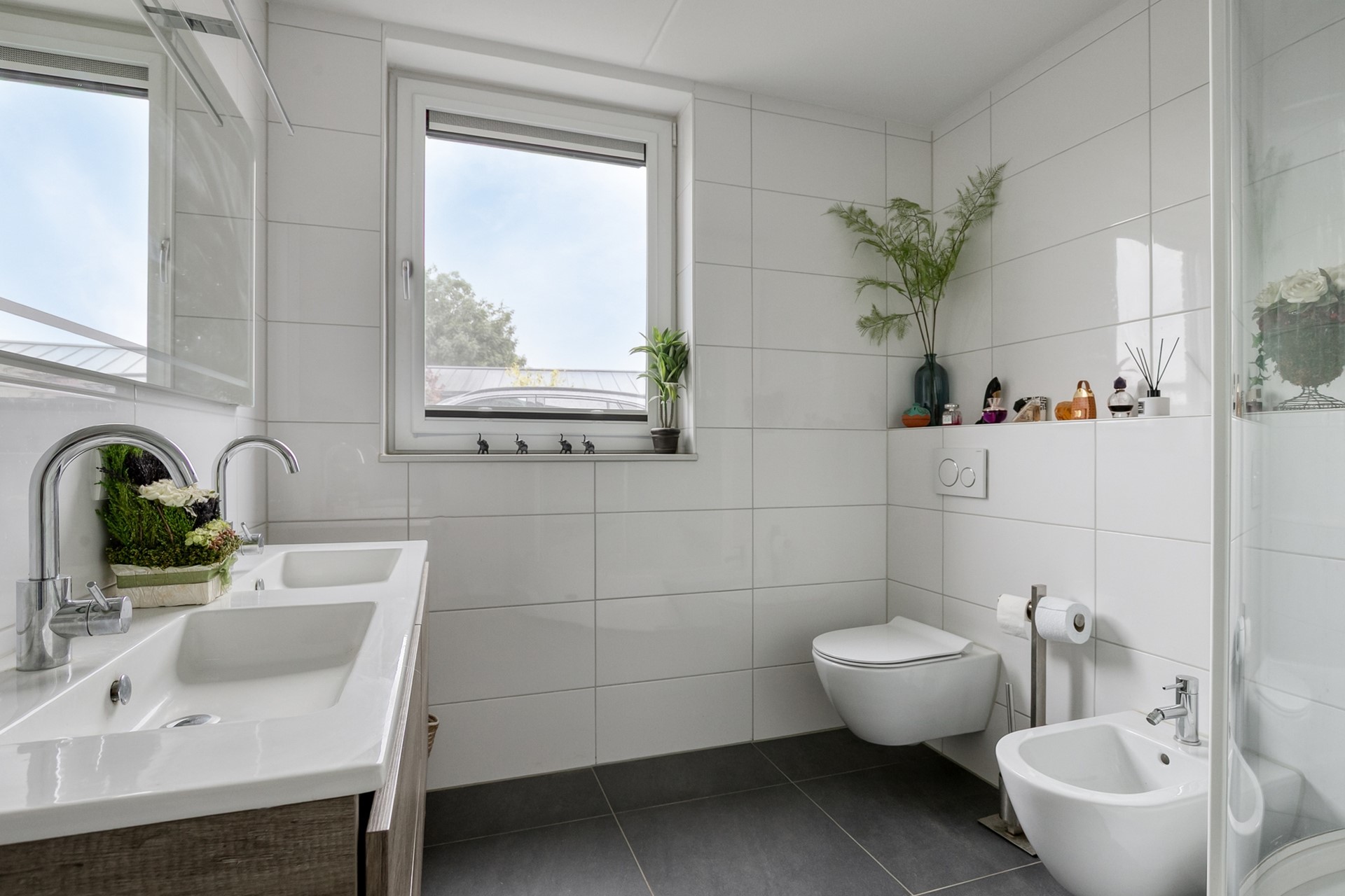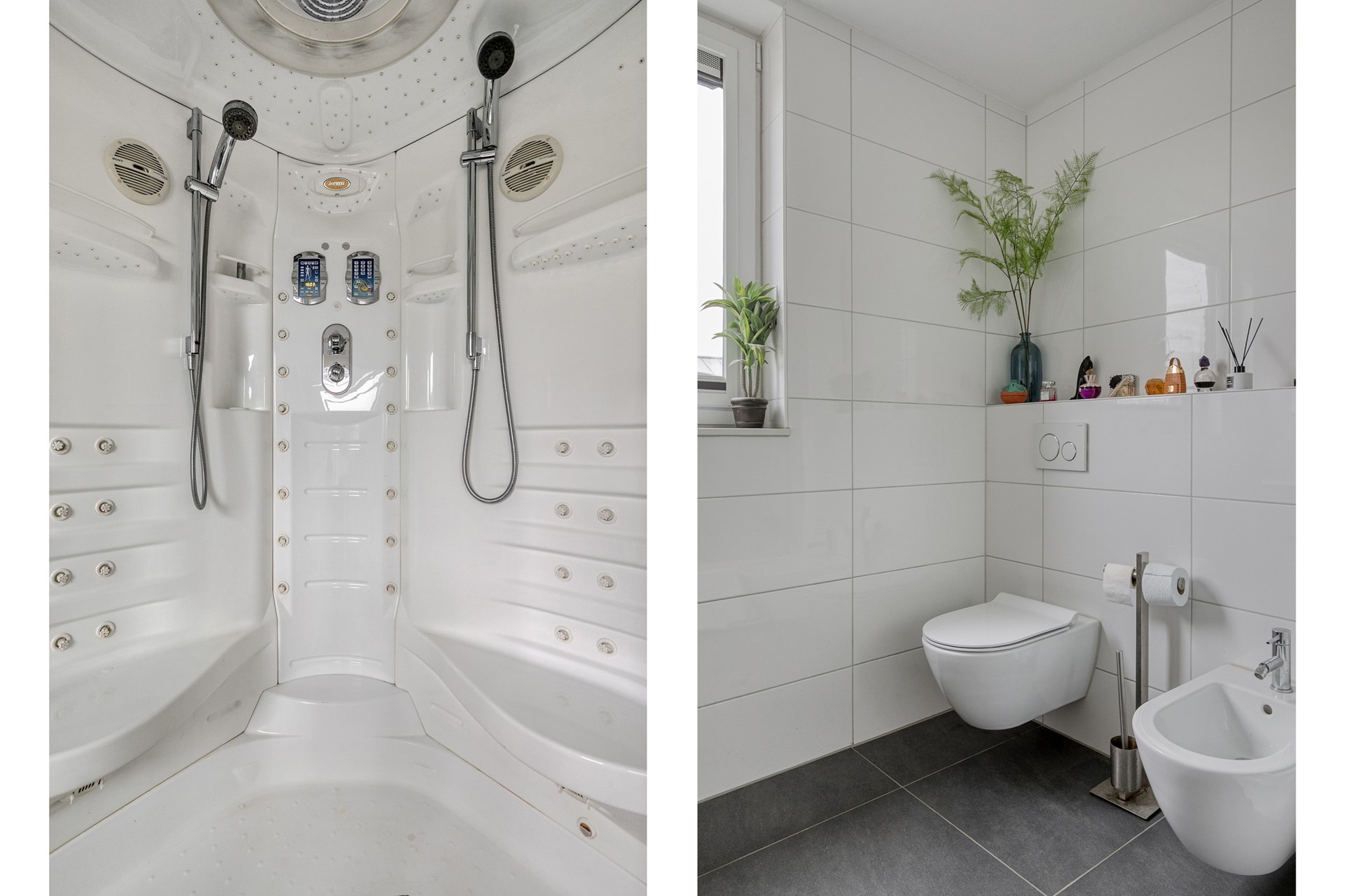 Badkamer met toilet, inloopdouche en wastafel, elektrische radiatoren
