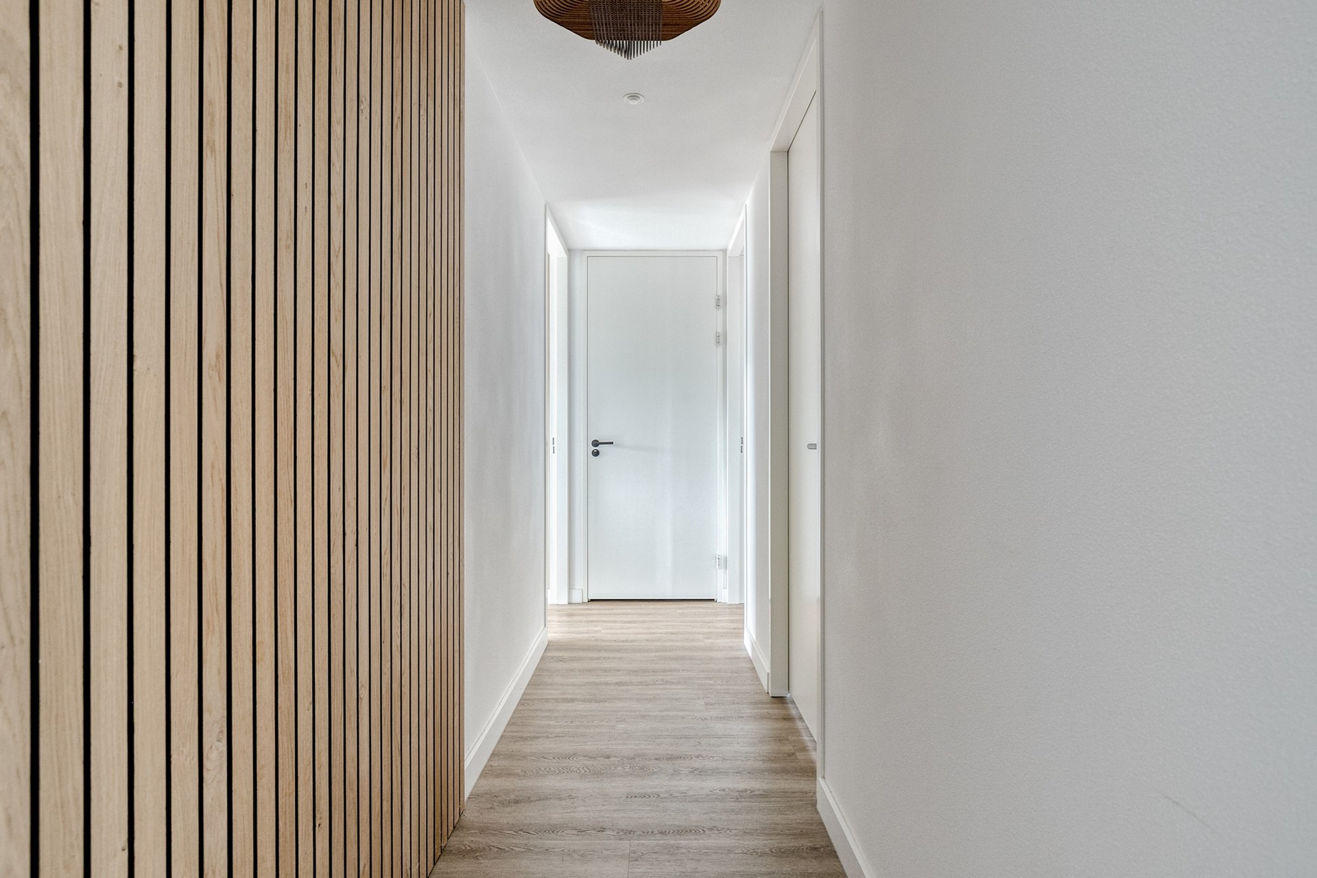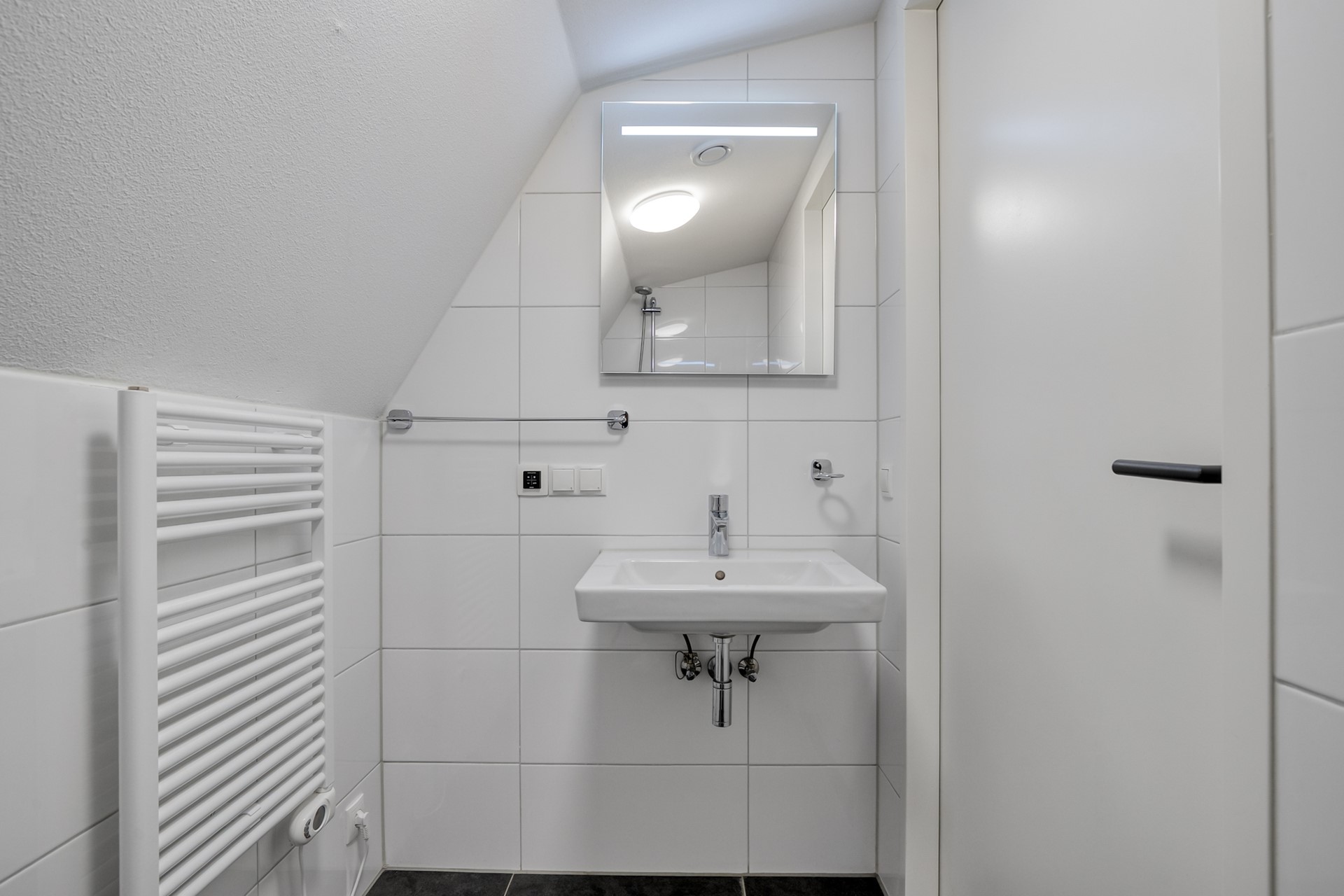 Overloop met toegang tot badkamer met douche en wastafel, elektrische radiatoren